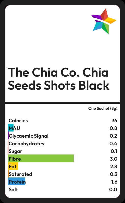The Chia Co. Chia Seeds Shots Black contains 35.8 calories in one Sachet (8g).
