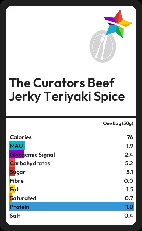 The Curators Beef Jerky Teriyaki Spice contains 76.2 calories in one Bag (30g).