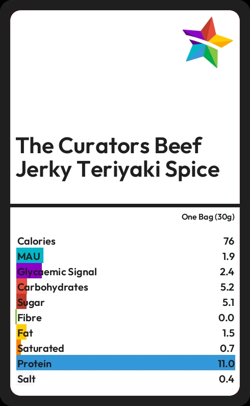 The Curators Beef Jerky Teriyaki Spice contains 5.1g sugar in one Bag (30g) - that is around 1 cube of sugar.