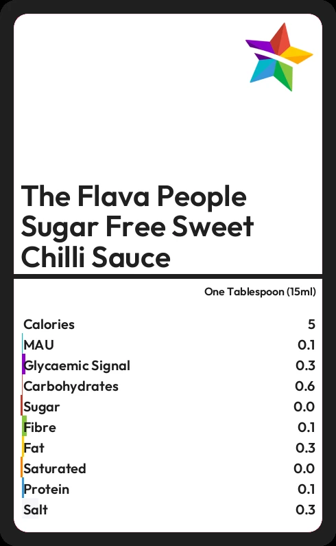The Flava People Sugar Free Sweet Chilli Sauce contains no sugar in one Tablespoon (15ml)