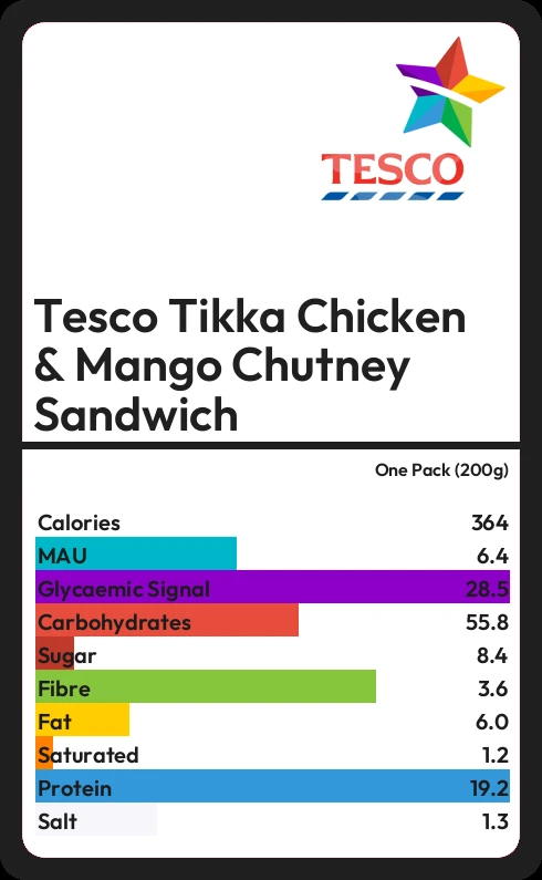 Tesco Tikka Chicken & Mango Chutney Sandwich contains 8.4g sugar in one Pack (200g) - that is around 2 cubes of sugar.