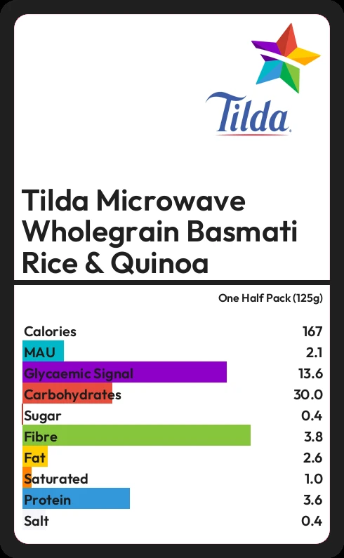 Tilda Microwave Wholegrain Basmati Rice & Quinoa contains 0.4g sugar in one Half Pack (125g)