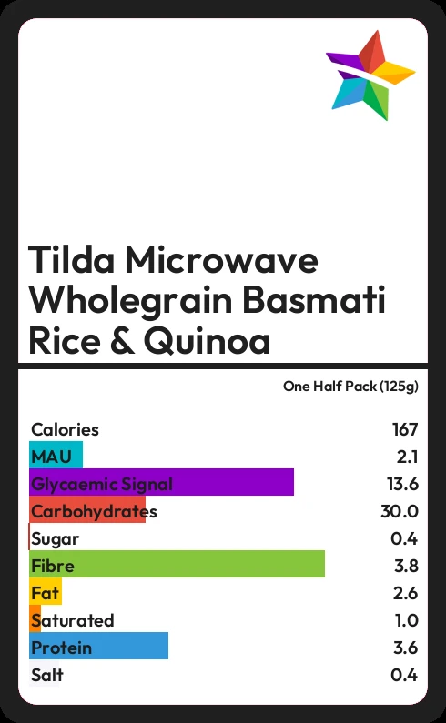 Tilda Microwave Wholegrain Basmati Rice & Quinoa contains 0.4g sugar in one Half Pack (125g)