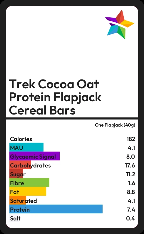 Trek Cocoa Oat Protein Flapjack Cereal Bars contains 182 calories in one Flapjack (40g).
