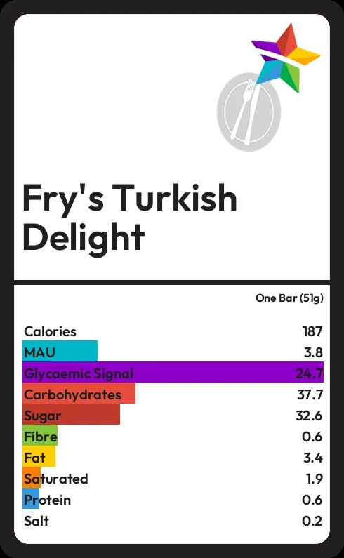 Fry's Turkish Delight contains 186.7 calories in one Bar (51g).
