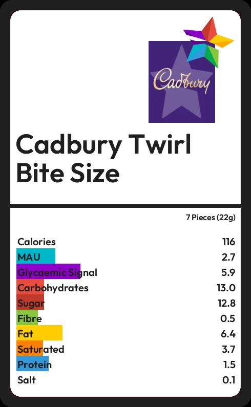 Cadbury Twirl Bite Size contains 12.8g sugar in 7 Pieces (22g) - that is around 3 cubes of sugar.