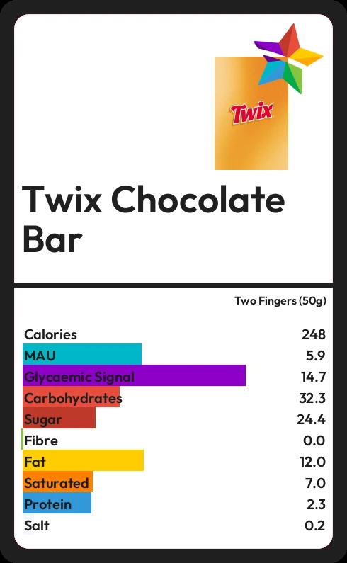 Twix Chocolate Bar contains 24.4g sugar in two Fingers (50g) - that is around 6 cubes of sugar.