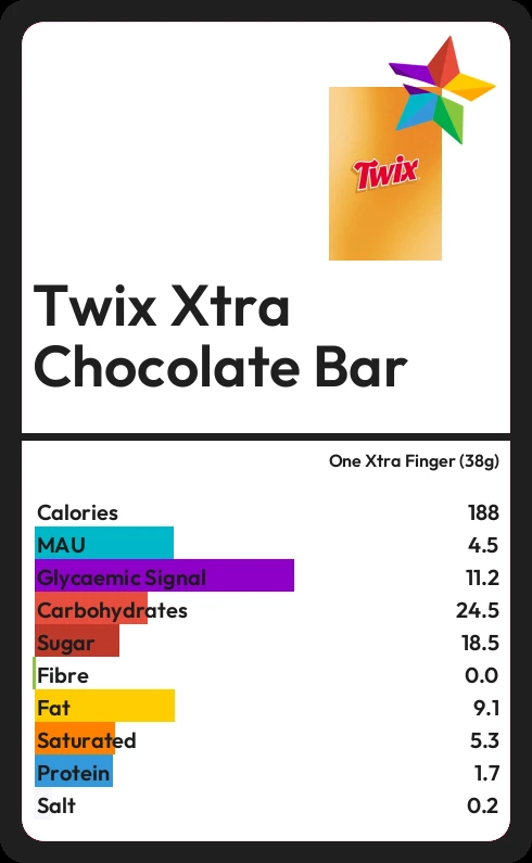 Twix Xtra Chocolate Bar contains 18.5g sugar in one Xtra Finger (38g) - that is around 5 cubes of sugar.