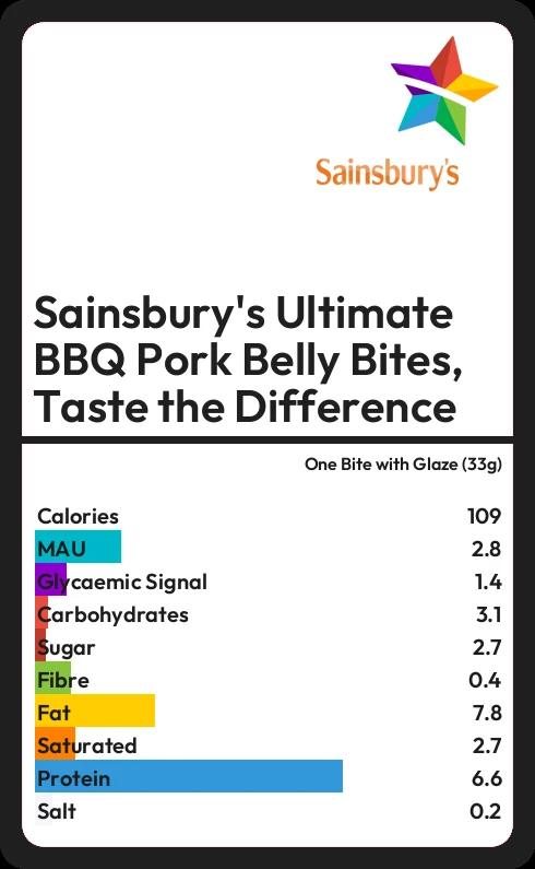 Sainsbury's Ultimate BBQ Pork Belly Bites, Taste the Difference contains 2.7g sugar in one Bite with Glaze (33g) - that is around 1 cube of sugar.