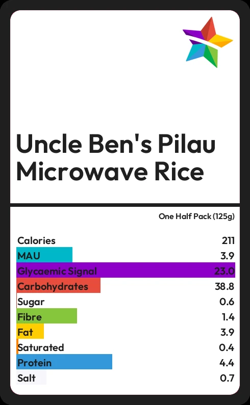 Uncle Ben's Pilau Microwave Rice contains 0.6g sugar in one Half Pack (125g)
