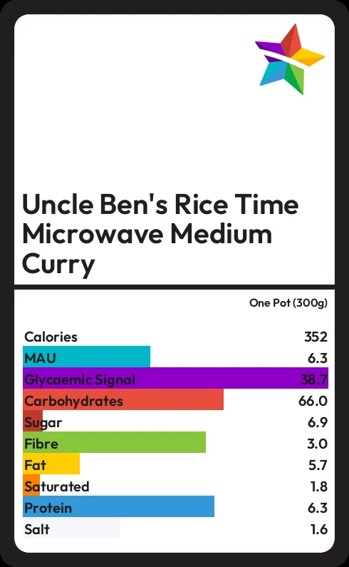 Uncle Ben's Rice Time Microwave Medium Curry contains 351 calories in one Pot (300g).