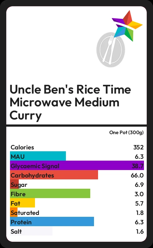 Uncle Ben's Rice Time Microwave Medium Curry contains 351 calories in one Pot (300g).