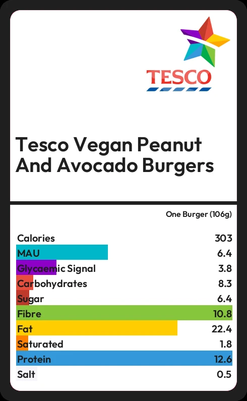 Tesco Vegan Peanut And Avocado Burgers contains 6.4g sugar in one Burger (106g) - that is around 2 cubes of sugar.