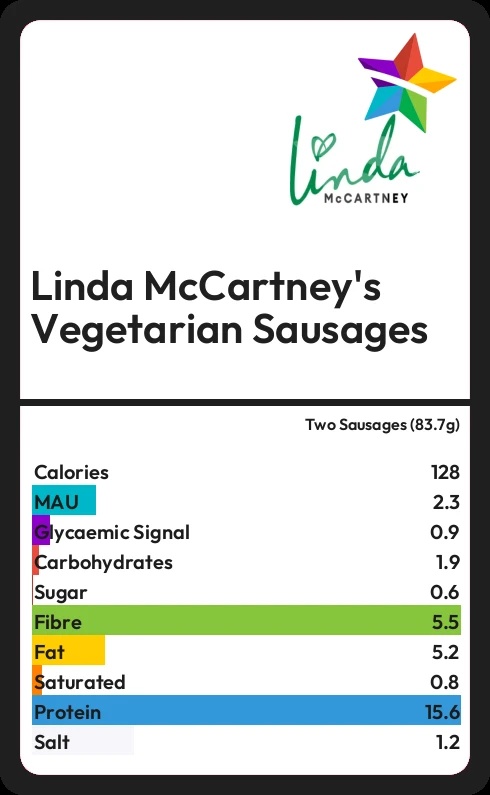 Linda McCartney's Vegetarian Sausages contains 0.6g sugar in two Sausages (83.7g)
