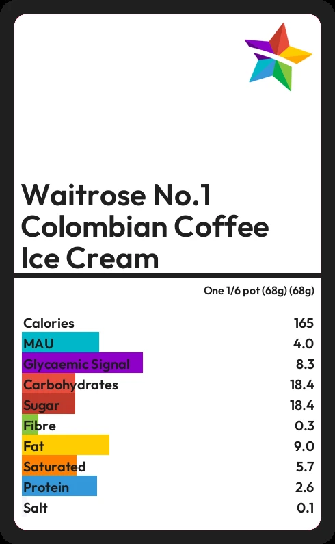 Waitrose No.1 Colombian Coffee Ice Cream contains 165.2 calories in one 1/6 pot (68g) (68g).