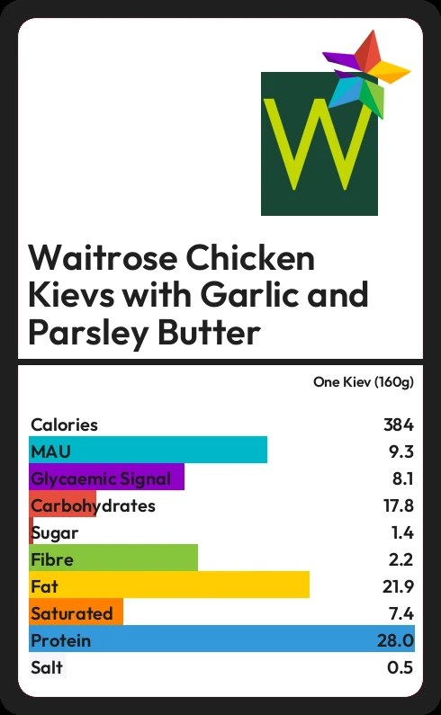 Waitrose Chicken Kievs with Garlic and Parsley Butter contains 1.4g sugar in one Kiev (160g)