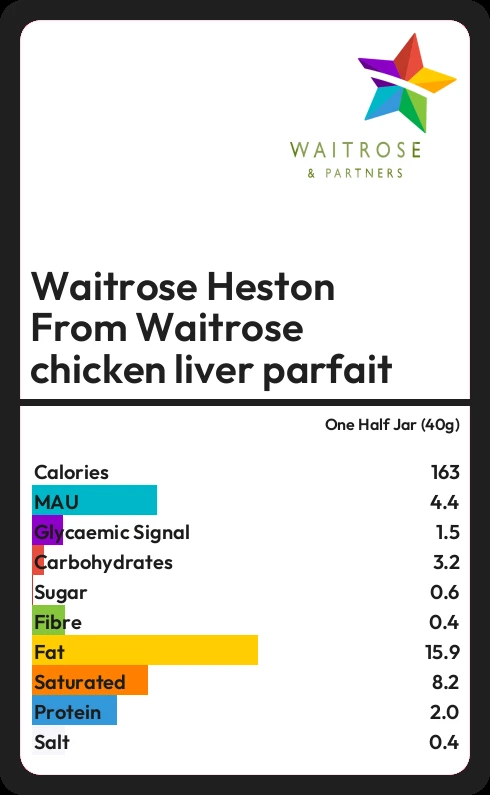 Waitrose Heston From Waitrose chicken liver parfait contains 163.2 calories in one Half Jar (40g).