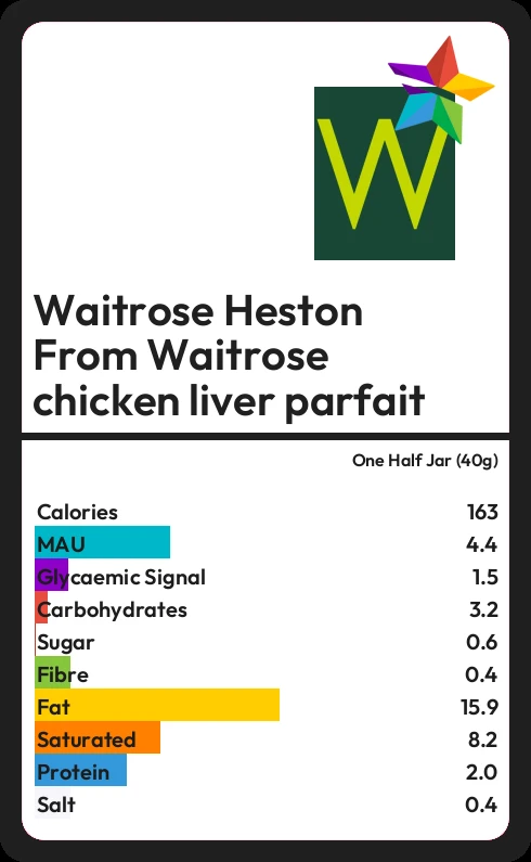 Waitrose Heston From Waitrose chicken liver parfait contains 163.2 calories in one Half Jar (40g).