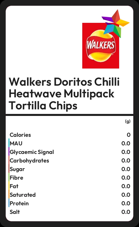 Walkers Doritos Chilli Heatwave Multipack Tortilla Chips contains 6.1g sugar in 100g - that is around 2 cubes of sugar.