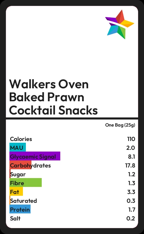 Walkers Oven Baked Prawn Cocktail Snacks contains 1.2g sugar in one Bag (25g)
