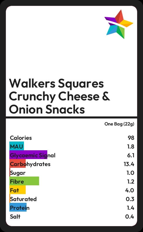 Walkers Squares Crunchy Cheese & Onion Snacks contains 1.0g sugar in one Bag (22g)