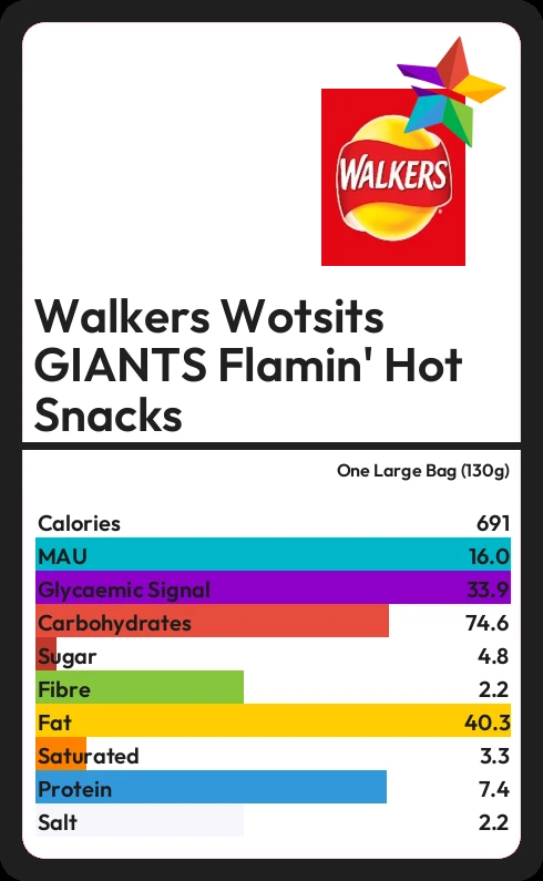 Walkers Wotsits GIANTS Flamin' Hot Snacks contains 690.3 calories in one Large Bag (130g).