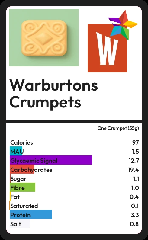 Warburtons Crumpets contains 1.1g sugar in one Crumpet (55g)