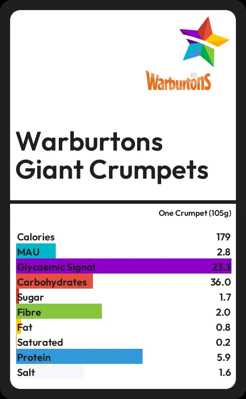 Warburtons Giant Crumpets contains 1.7g sugar in one Crumpet (105g)
