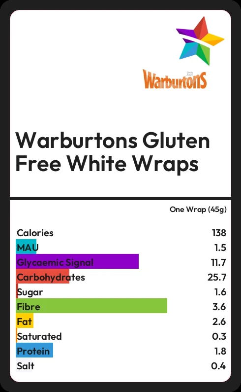 Warburtons Gluten Free White Wraps contains 1.6g sugar in one Wrap (45g)