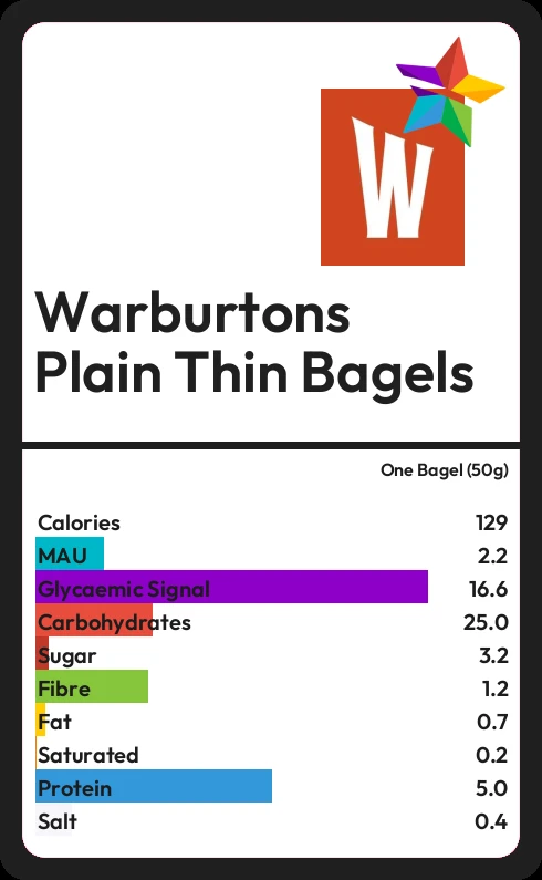 Warburtons Plain Thin Bagels contains 129 calories in one Bagel (50g).