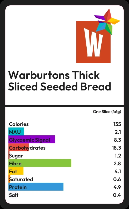 Warburtons Thick Sliced Seeded Bread contains 1.2g sugar in one Slice (46g)