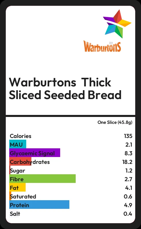 Warburtons Thick Sliced Seeded Bread contains 1.2g sugar in one Slice (45.8g)