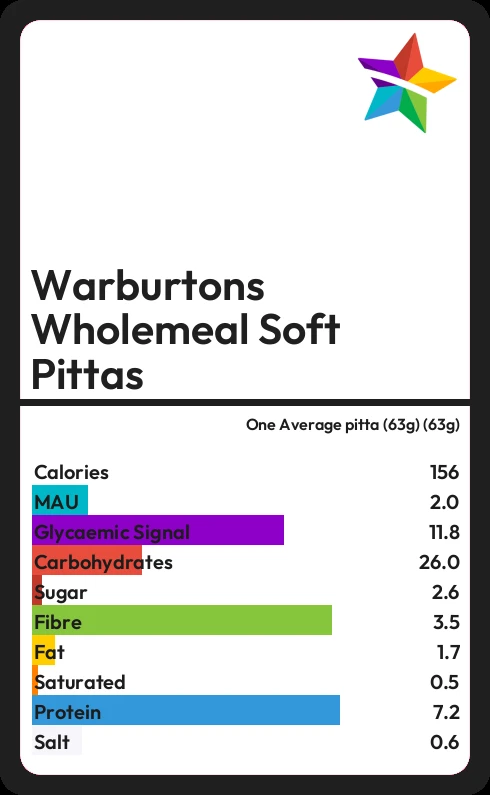 Warburtons Wholemeal Soft Pittas contains 156.2 calories in one Average pitta (63g) (63g).