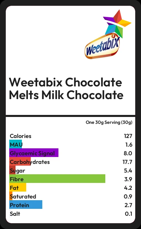 Weetabix Chocolate Melts Milk Chocolate contains 127.5 calories in one 30g Serving (30g).