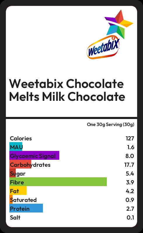 Weetabix Chocolate Melts Milk Chocolate contains 127.5 calories in one 30g Serving (30g).