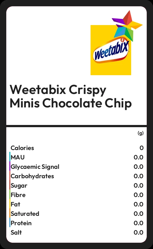 Weetabix Crispy Minis Chocolate Chip contains 394 calories in 100g.