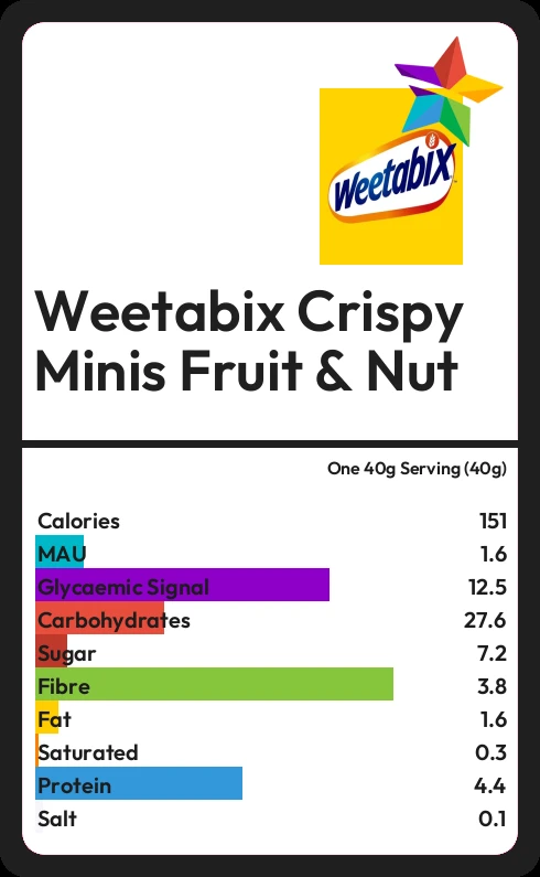 Weetabix Crispy Minis Fruit & Nut contains 151.2 calories in one 40g Serving (40g).
