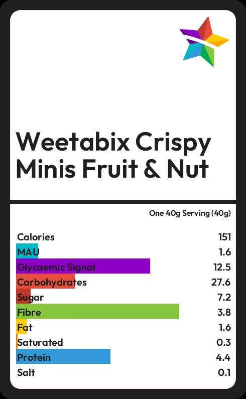 Weetabix Crispy Minis Fruit & Nut contains 151.2 calories in one 40g Serving (40g).
