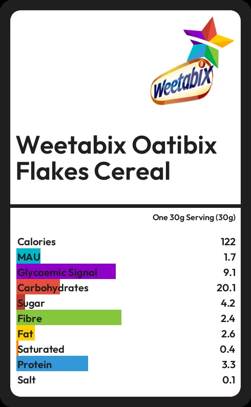 Weetabix Oatibix Flakes Cereal contains 122.4 calories in one 30g Serving (30g).