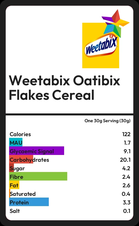 Weetabix Oatibix Flakes Cereal contains 122.4 calories in one 30g Serving (30g).