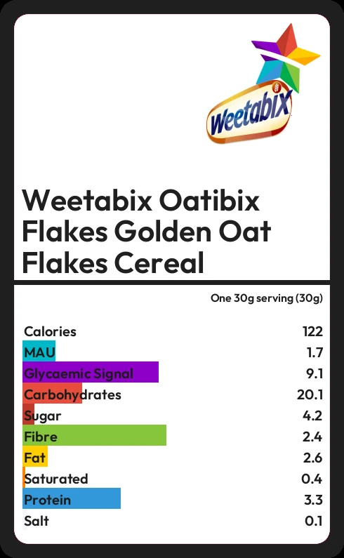 Weetabix Oatibix Flakes Golden Oat Flakes Cereal contains 122.4 calories in one 30g serving (30g).