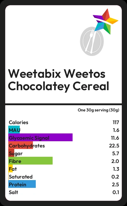 Weetabix Weetos Chocolatey Cereal contains 117 calories in one 30g serving (30g).