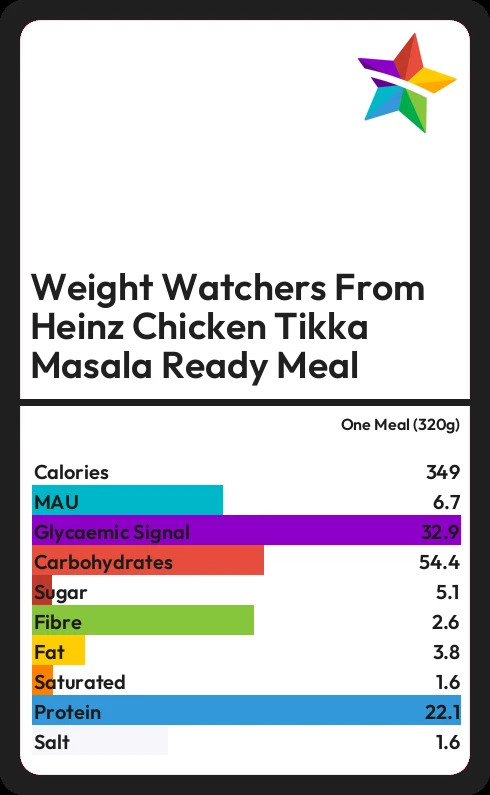 Weight Watchers From Heinz Chicken Tikka Masala Ready Meal contains 348.8 calories in one Meal (320g).
