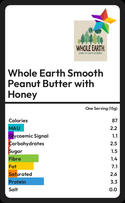 Whole Earth Smooth Peanut Butter with Honey contains 1.5g sugar in one Serving (15g)