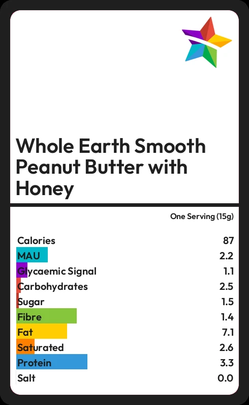 Whole Earth Smooth Peanut Butter with Honey contains 1.5g sugar in one Serving (15g)