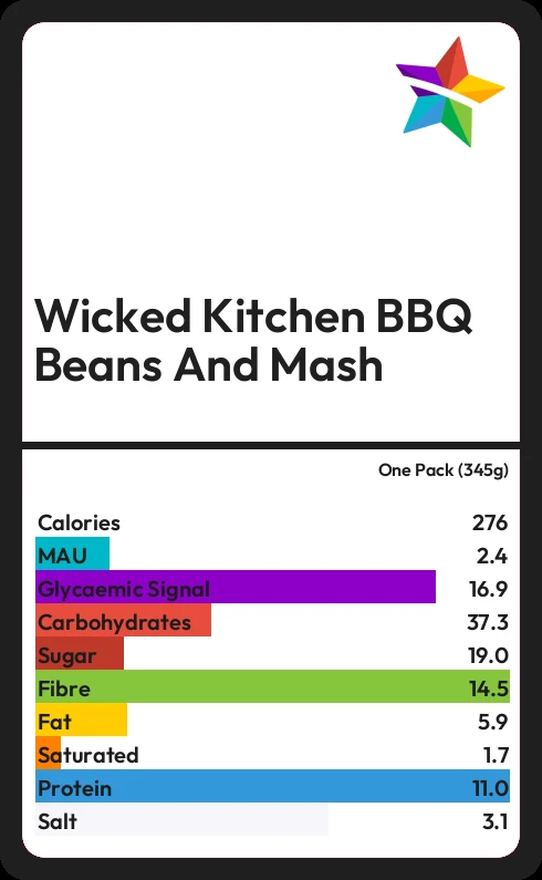 Wicked Kitchen BBQ Beans And Mash contains 19.0g sugar in one Pack (345g) - that is around 5 cubes of sugar.