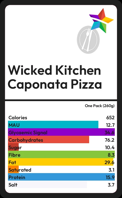 Wicked Kitchen Caponata Pizza contains 10.4g sugar in one Pack (260g) - that is around 3 cubes of sugar.