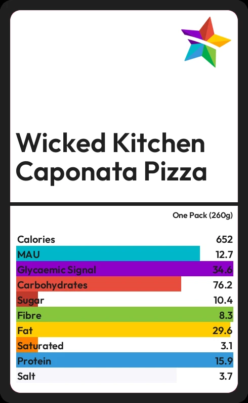 Wicked Kitchen Caponata Pizza contains 10.4g sugar in one Pack (260g) - that is around 3 cubes of sugar.