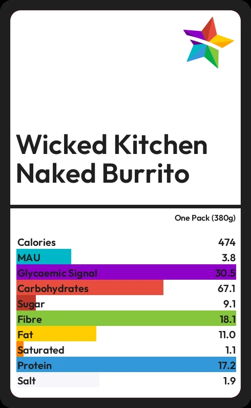 Wicked Kitchen Naked Burrito contains 9.1g sugar in one Pack (380g) - that is around 2 cubes of sugar.