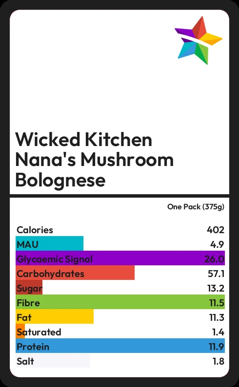 Wicked Kitchen Nana's Mushroom Bolognese contains 401.3 calories in one Pack (375g).